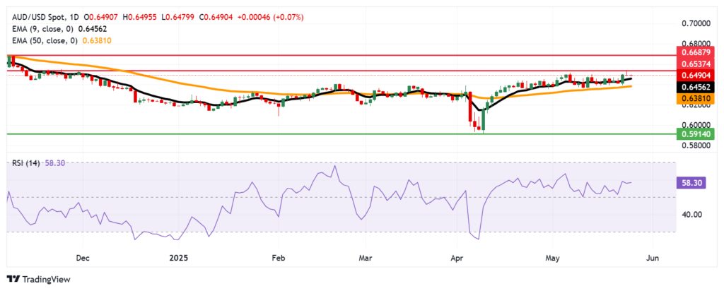 Pasangan AUD/USD diperdagangkan di sekitar 0,6490 pada hari Selasa, dengan indikator teknis harian menunjukkan bias bullish yang persisten karena pasangan ini tetap di atas Exponential Moving Average (EMA) sembilan hari. Selain itu, Relative Strength Index (RSI) 14-hari mempertahankan posisinya di atas angka 50, mendukung prospek kenaikan.