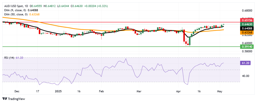 Pasangan mata uang AUD/USD diperdagangkan di sekitar 0,6460 pada hari Senin, mempertahankan bias bullish pada grafik harian. Pasangan mata uang ini terus bertahan di atas Exponential Moving Average (EMA) sembilan hari, sementara Relative Strength Index (RSI) 14-hari tetap nyaman di atas 50, keduanya mengindikasikan momentum ke atas yang berkelanjutan.