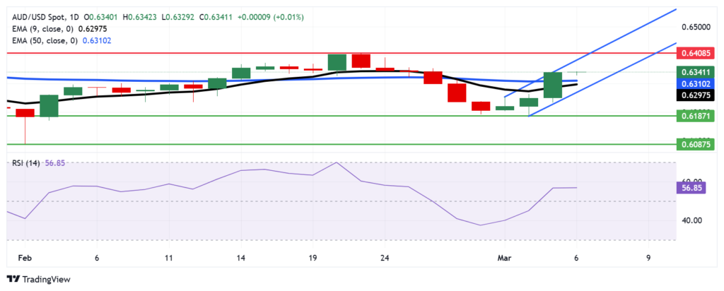 AUD/USD diperdagangkan dekat 0,6330 pada hari Kamis, dengan analisis teknis grafik harian menunjukkan pergerakan naik dalam pola ascending channel yang baru terbentuk, mengindikasikan bias bullish. Relative Strength Index (RSI) 14-hari tetap di atas 50, semakin mendukung prospek bullish.