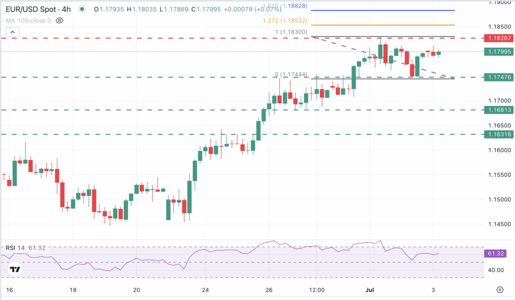 Grafik 4 jam menunjukkan tren bullish tetap utuh, dengan Relative Strength Index (RSI) 14-periode jauh di atas level 50. Support terdekat berada di level terendah hari Rabu, di 1,1745. Lebih jauh ke bawah, area antara level terendah 27 Juni di 1,1680 dan level terendah 26 Juni di 1,1650 menawarkan support signifikan untuk koreksi bearish.